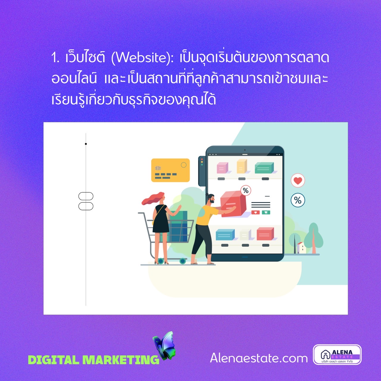 1. เว็บไซต์ (Website): เป็นจุดเริ่มต้นของการตลาดออนไลน์ และเป็นสถานที่ที่ลูกค้าสามารถเข้าชมและเรียนรู้เกี่ยวกับธุรกิจของคุณได้