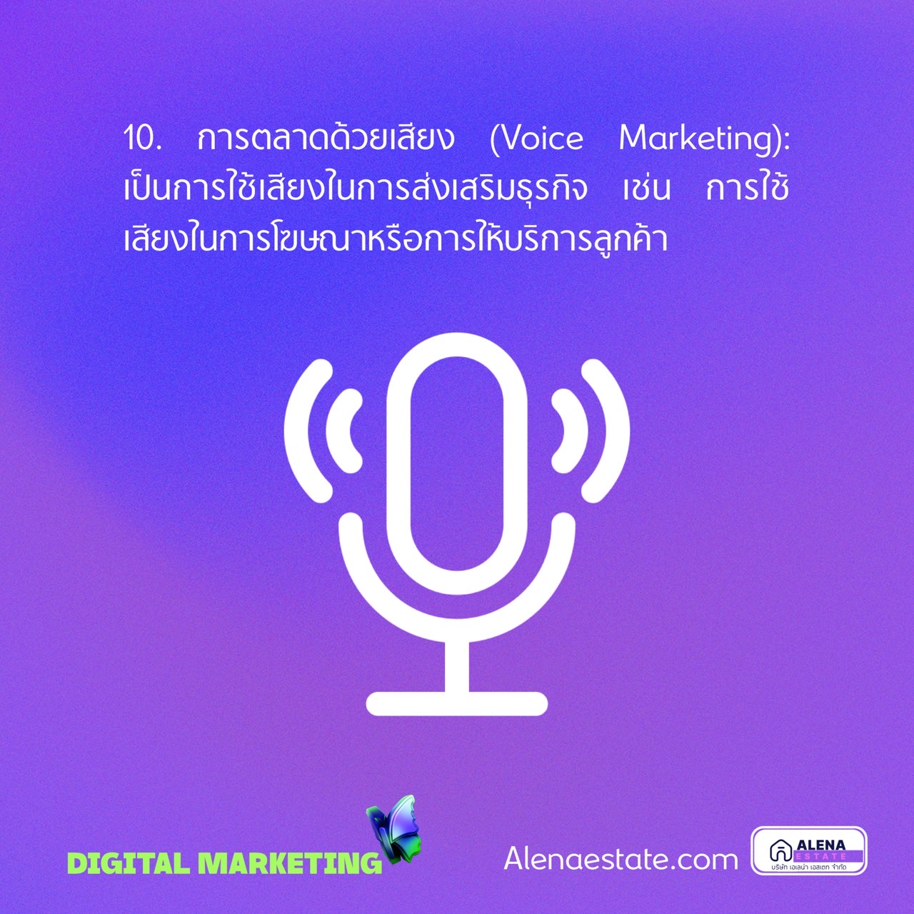 10. การตลาดด้วยเสียง (Voice Marketing): เป็นการใช้เสียงในการส่งเสริมธุรกิจ เช่น การใช้เสียงในการโฆษณาหรือการให้บริการลูกค้า