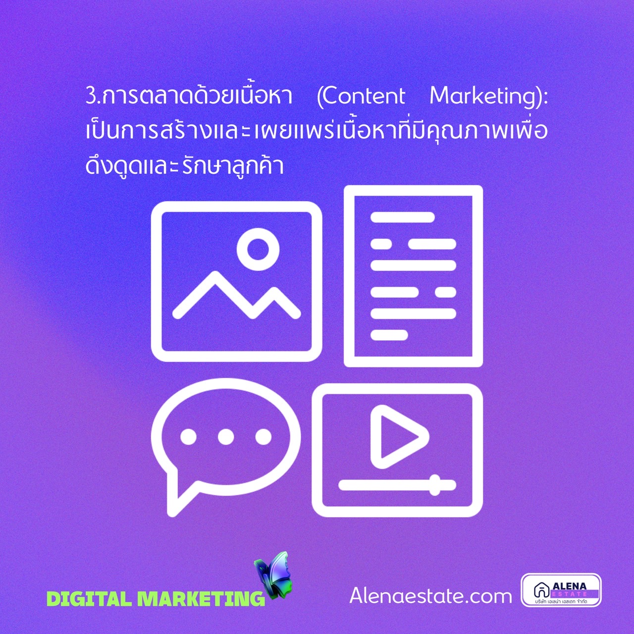 3. การตลาดด้วยเนื้อหา (Content Marketing): เป็นการสร้างและเผยแพร่เนื้อหาที่มีคุณภาพเพื่อดึงดูดและรักษาลูกค้า