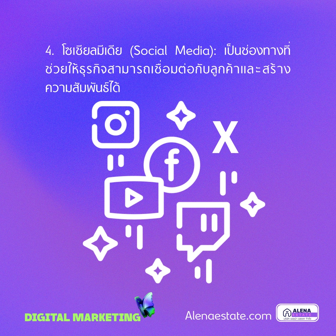 4. โซเชียลมีเดีย (Social Media): เป็นช่องทางที่ช่วยให้ธุรกิจสามารถเชื่อมต่อกับลูกค้าและสร้างความสัมพันธ์ได้