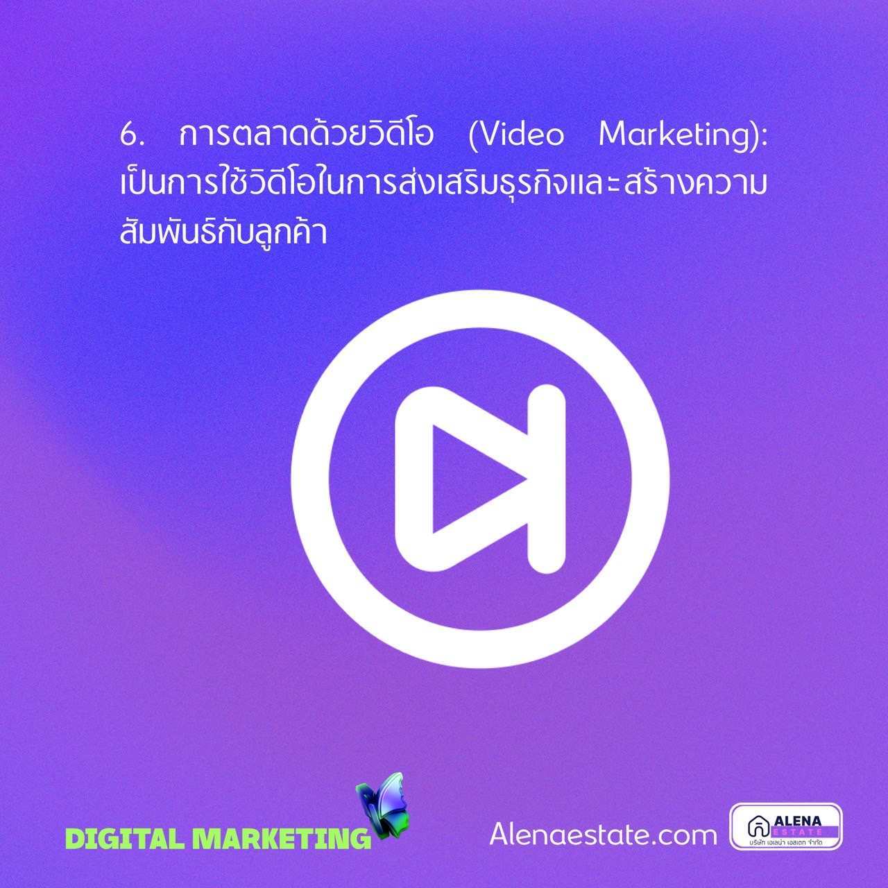 6. การตลาดด้วยวิดีโอ (Video Marketing): เป็นการใช้วิดีโอในการส่งเสริมธุรกิจและสร้างความสัมพันธ์กับลูกค้า