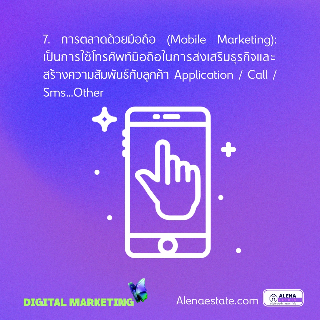 7. การตลาดด้วยมือถือ (Mobile Marketing): เป็นการใช้โทรศัพท์มือถือในการส่งเสริมธุรกิจและสร้างความสัมพันธ์กับลูกค้า Application / Call / Sms…Other