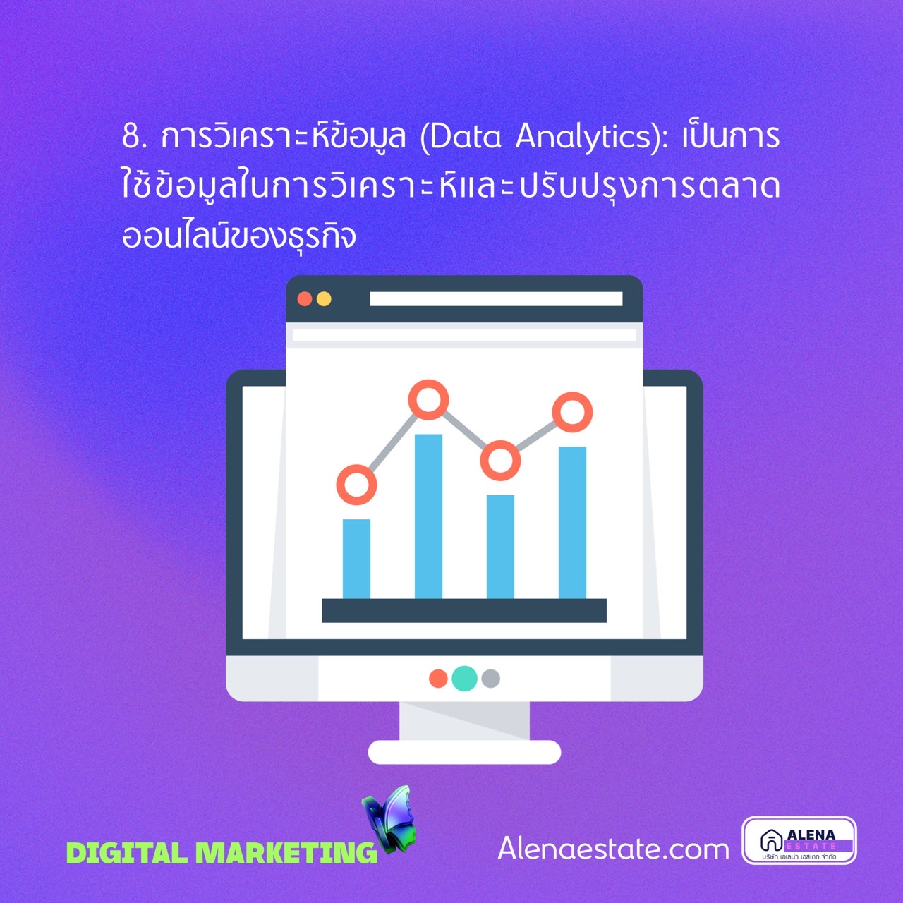 8. การวิเคราะห์ข้อมูล (Data Analytics): เป็นการใช้ข้อมูลในการวิเคราะห์และปรับปรุงการตลาดออนไลน์ของธุรกิจ