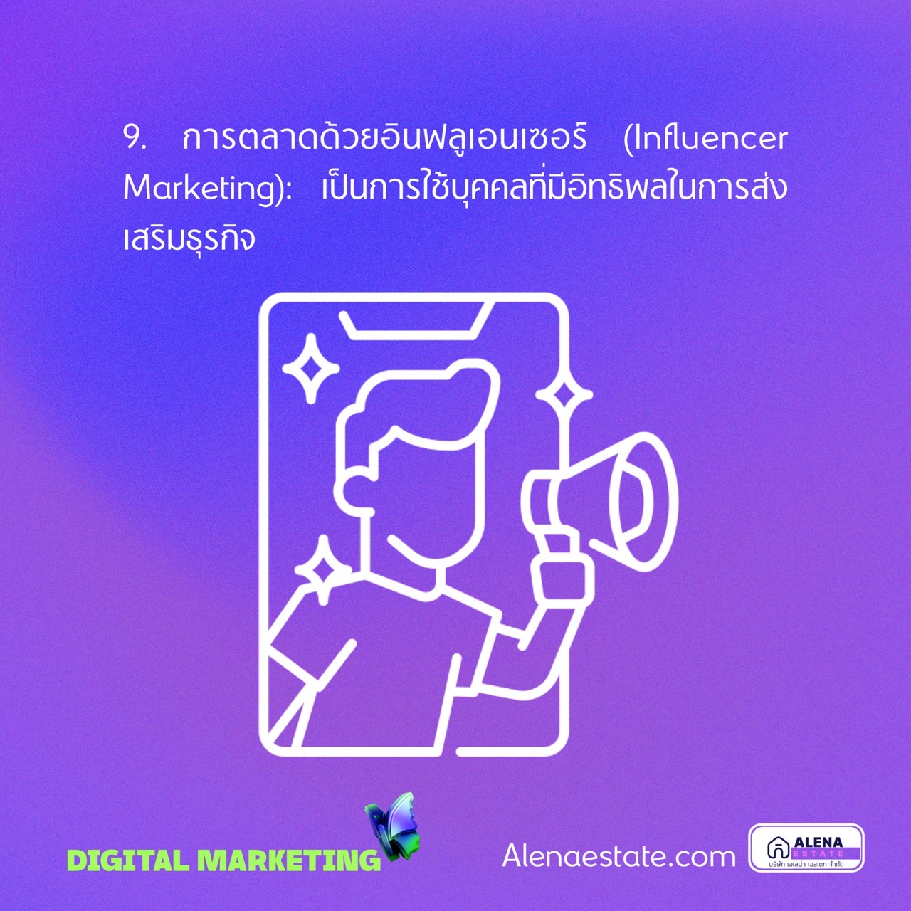 9. การตลาดด้วยอินฟลูเอนเซอร์ (Influencer Marketing): เป็นการใช้บุคคลที่มีอิทธิพลในการส่งเสริมธุรกิจ